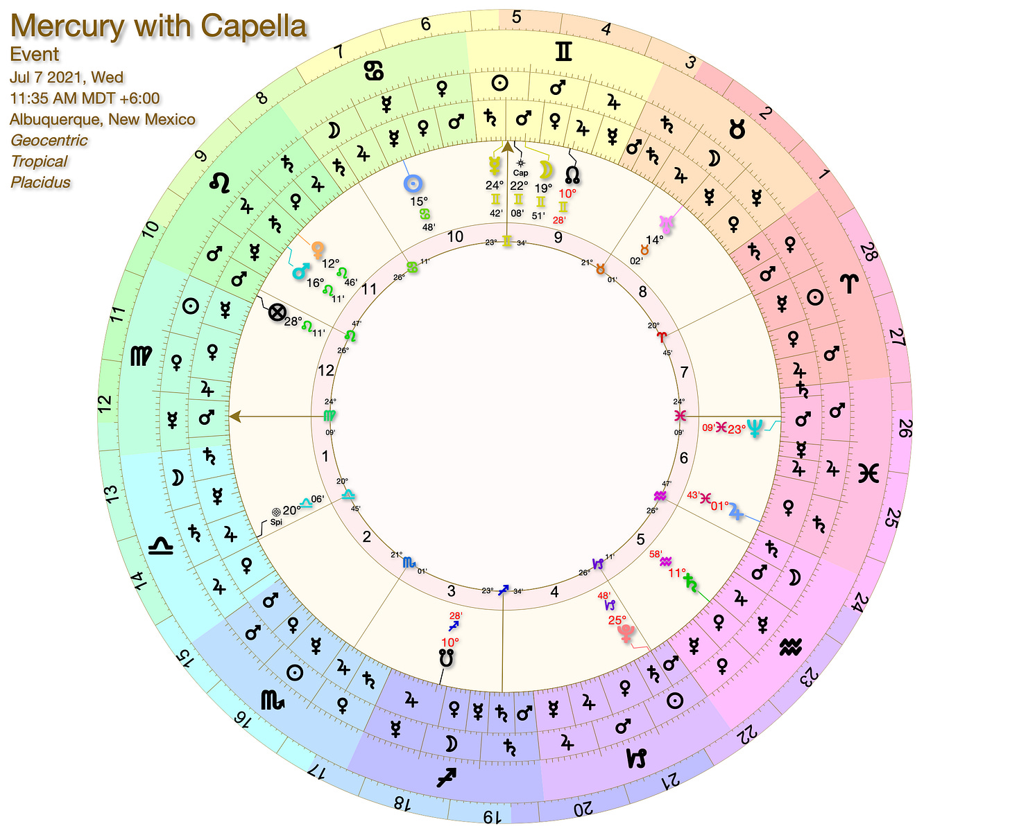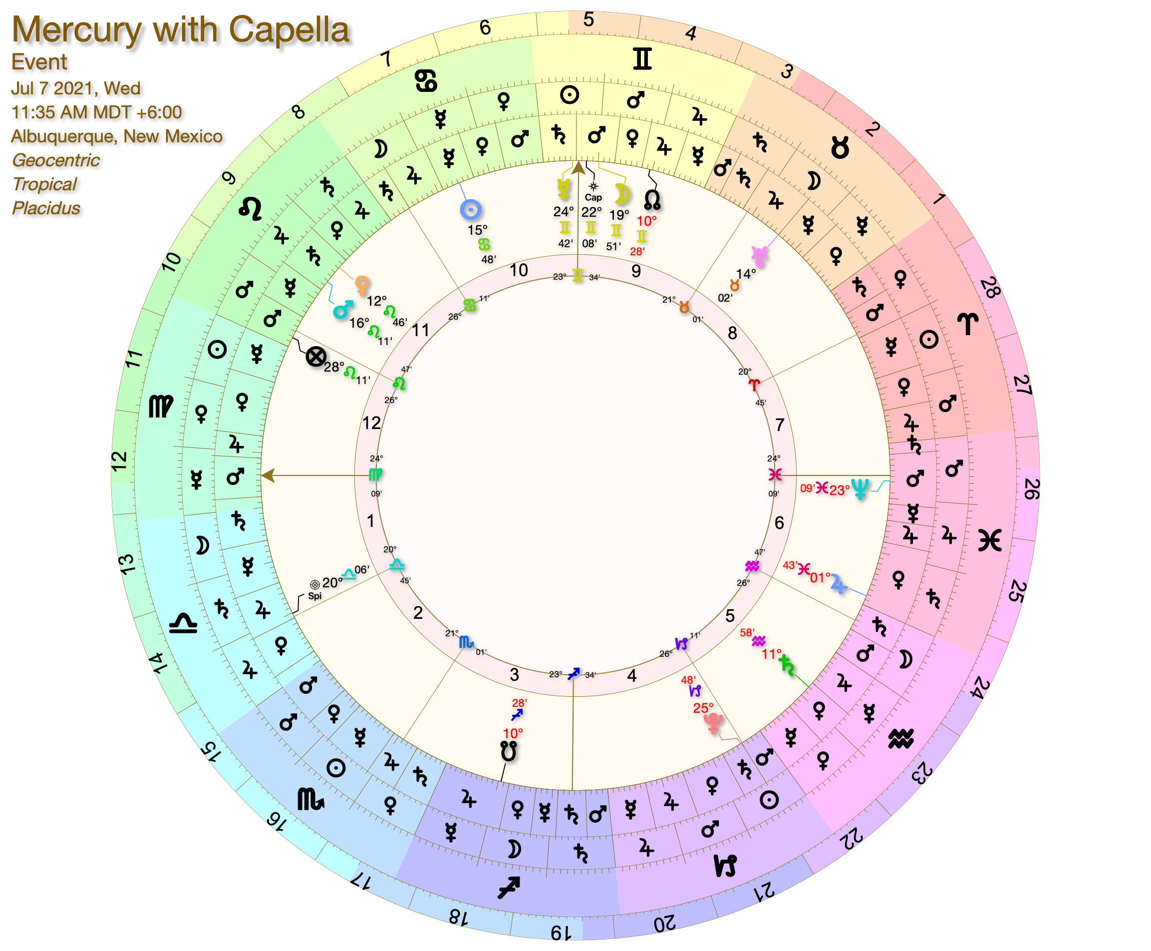 My intent in this essay today isn’t to teach you how to find astrological elections (you can seek that out yourself) but I certainly don’t want to blow past the election. I set my chart for 11:35 AM on 7 July 2021 in Albuquerque, New Mexico, USA.